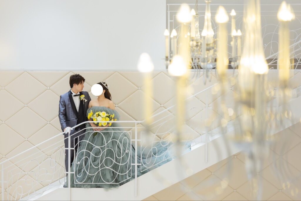 隣に立つ奥様は、純白ではなく、非常に美しく上品な「薄緑色(スモーキーグリーン)」のウェディングドレスに身を包んでおり、そのセンスの良さが光ります。