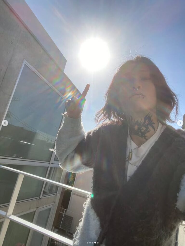 「最近=細菌」という独特なフレーズと共に披露されたその姿は、首筋の緻密なタトゥーが彼のシルエットを際立たせています。