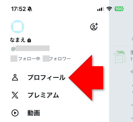 メニューが表示されるので一番上の「プロフィール」をタップします。