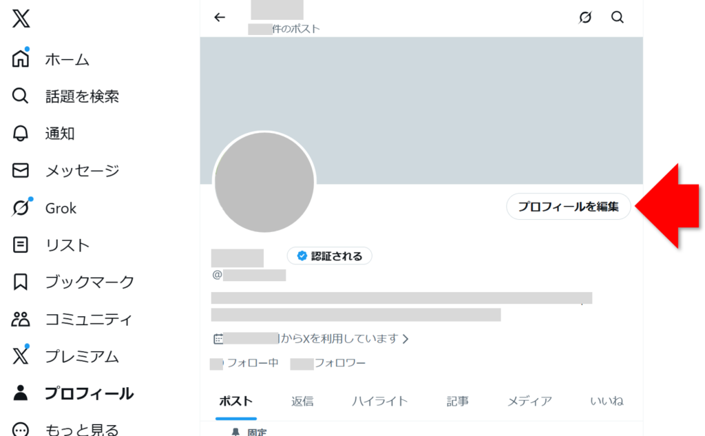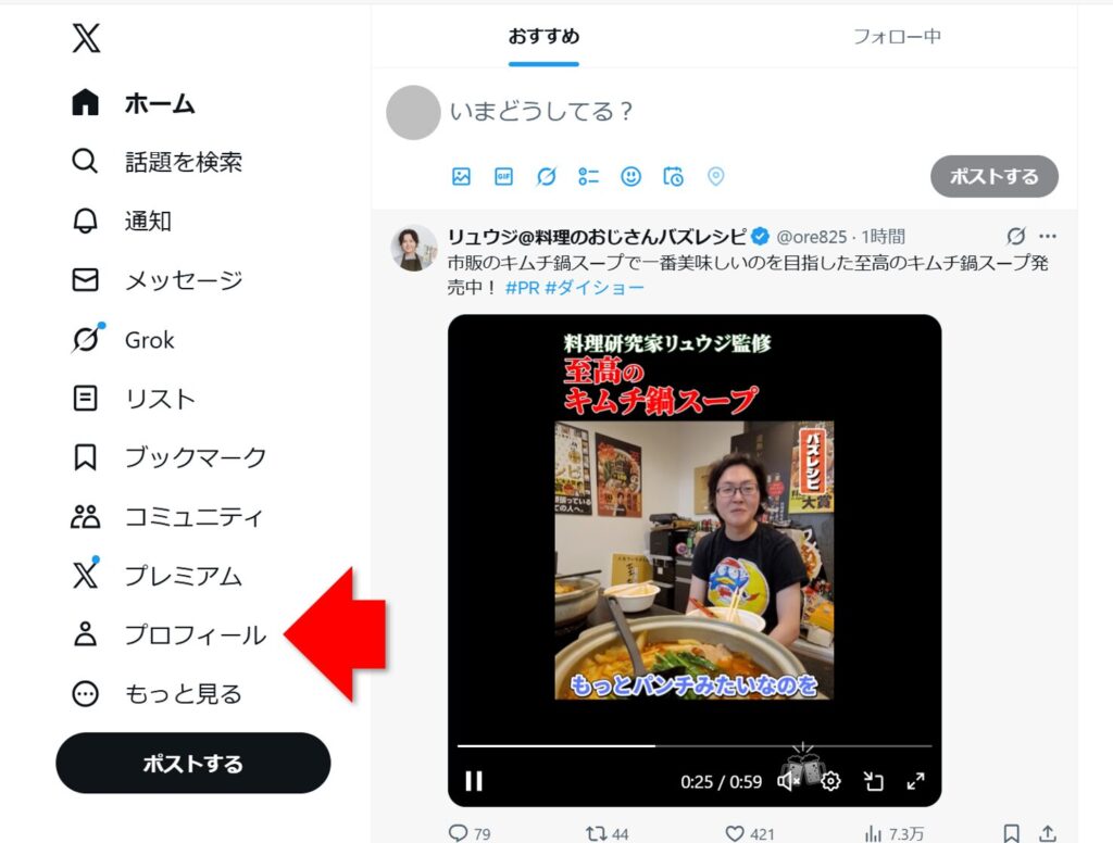 ▼ブラウザでXにログインし、左側メニューの「プロフィール」をクリックします。