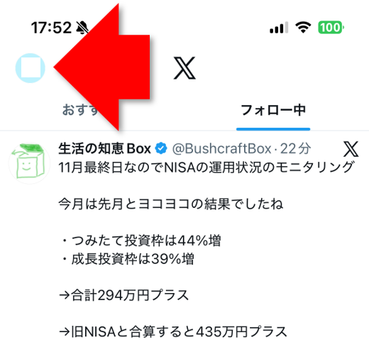 まずXアプリを開き、ホーム画面で左上の自分の「アイコン」をタップします。