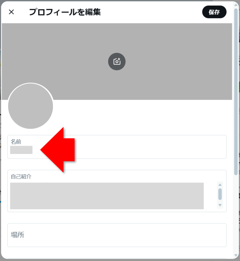 ▼プロフィール編集パネルが開いたら、「名前」の下の表示名入力欄にカーソルを置き、現在の本名を消して新しい表示名を入力します。