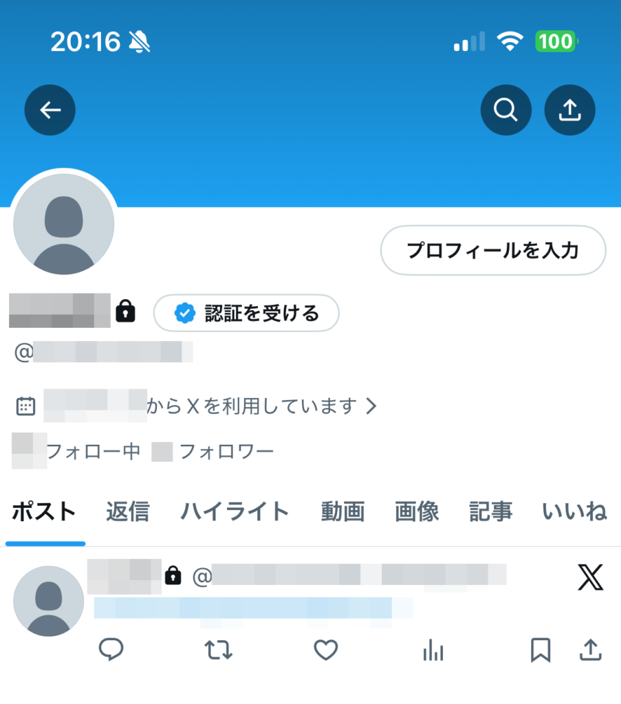 プロフィールの自己紹介欄が未入力だと上の画像のように「プロフィールを入力」と表示されます。